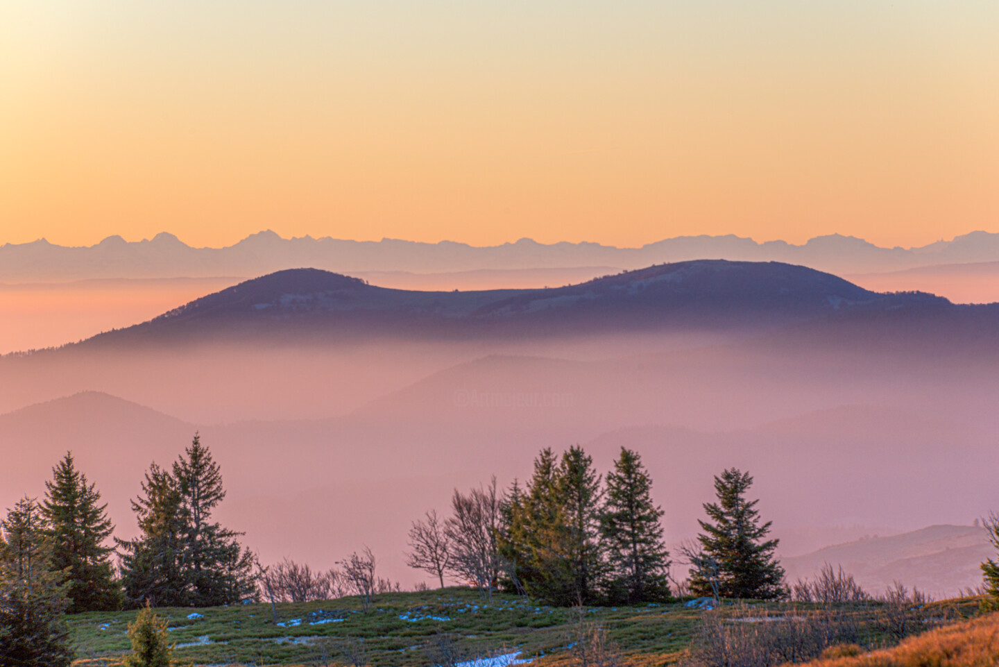 Le soleil se lève sur les ballons ronds des montagnes des Hautes-Vosges avec la silhouette escarpée de la chaîne des Alpes Suisse en arrière plan.